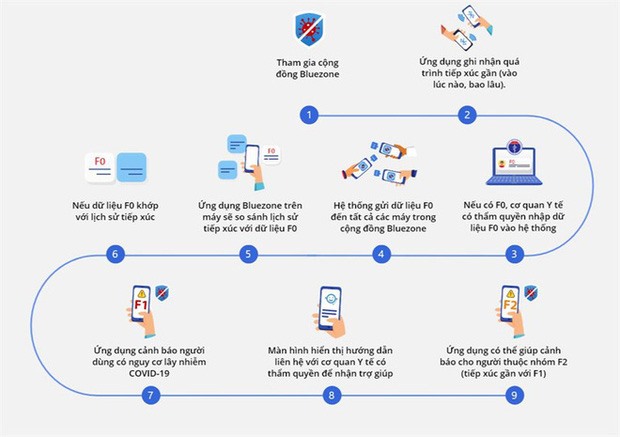 Ví dụ: Nếu phát hiện một người nhiễm bệnh Covid-19 (F0), dữ liệu của người nhiễm bệnh sẽ được nhập lên trên hệ thống, người sử dụng Bluezone sẽ biết mình có thuộc diện "F" nào và có đảm bảo an toàn hay không.