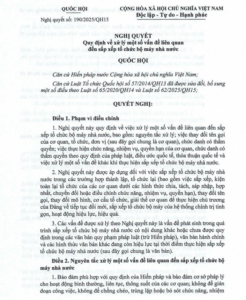 Toàn văn Nghị quyết số 190/2025/QH15 về xử lý một số vấn đề liên quan đến sắp xếp tổ chức bộ máy nhà nước