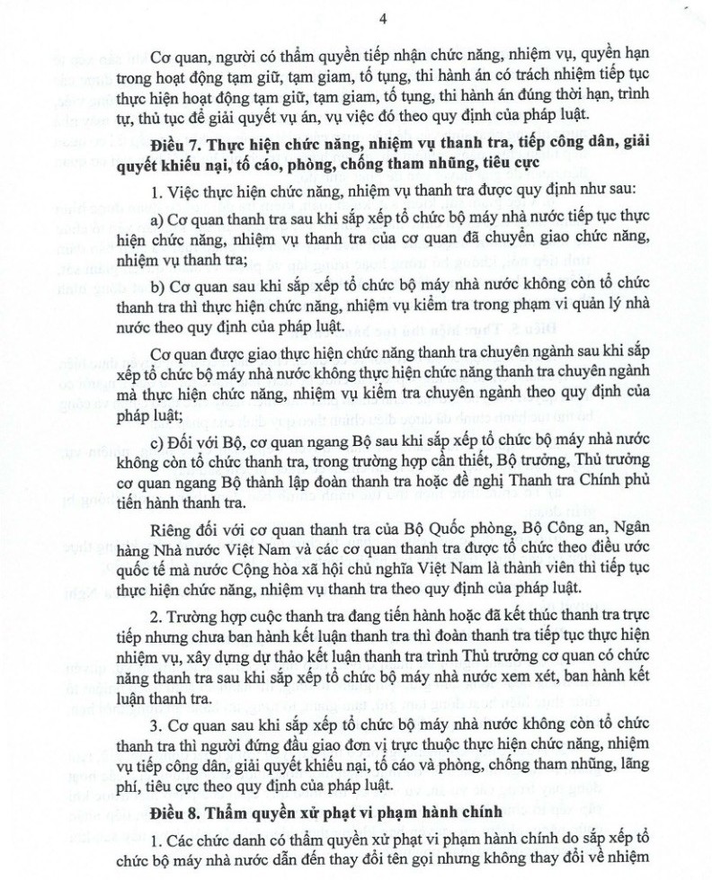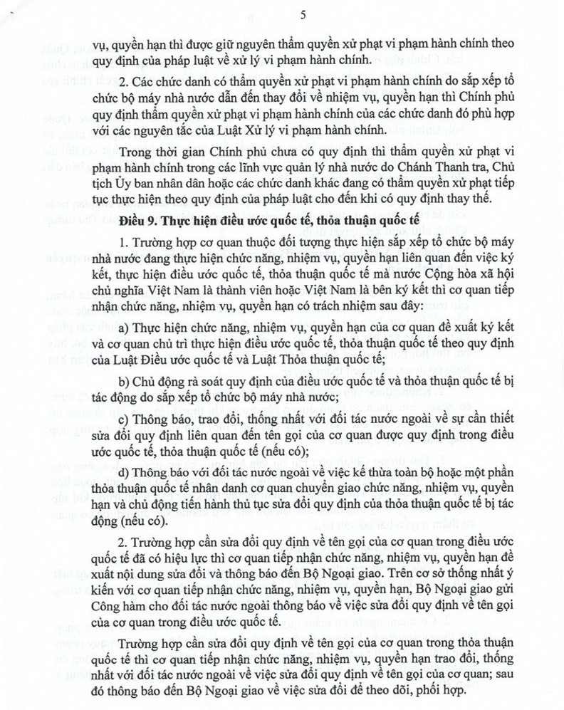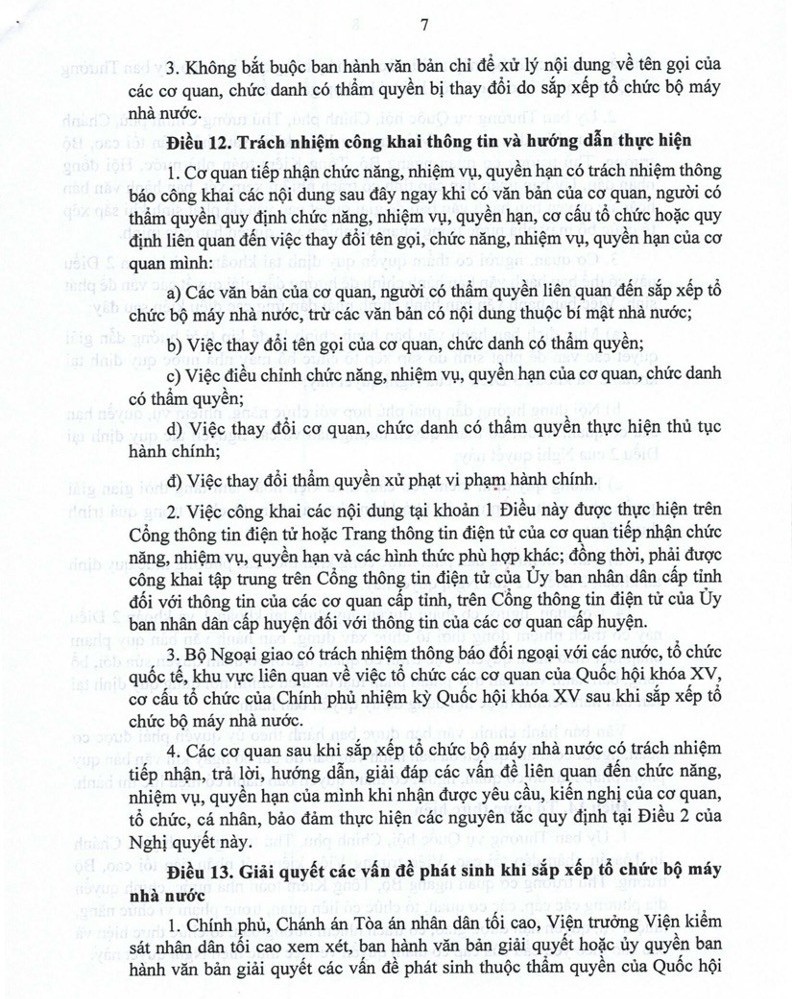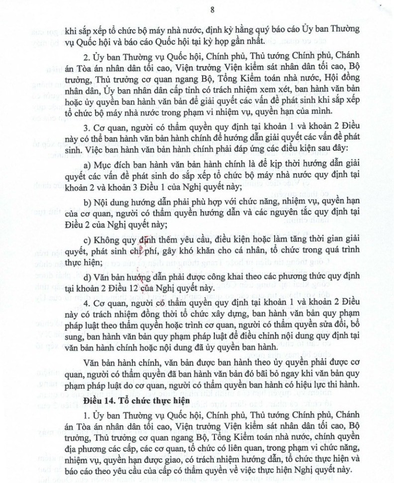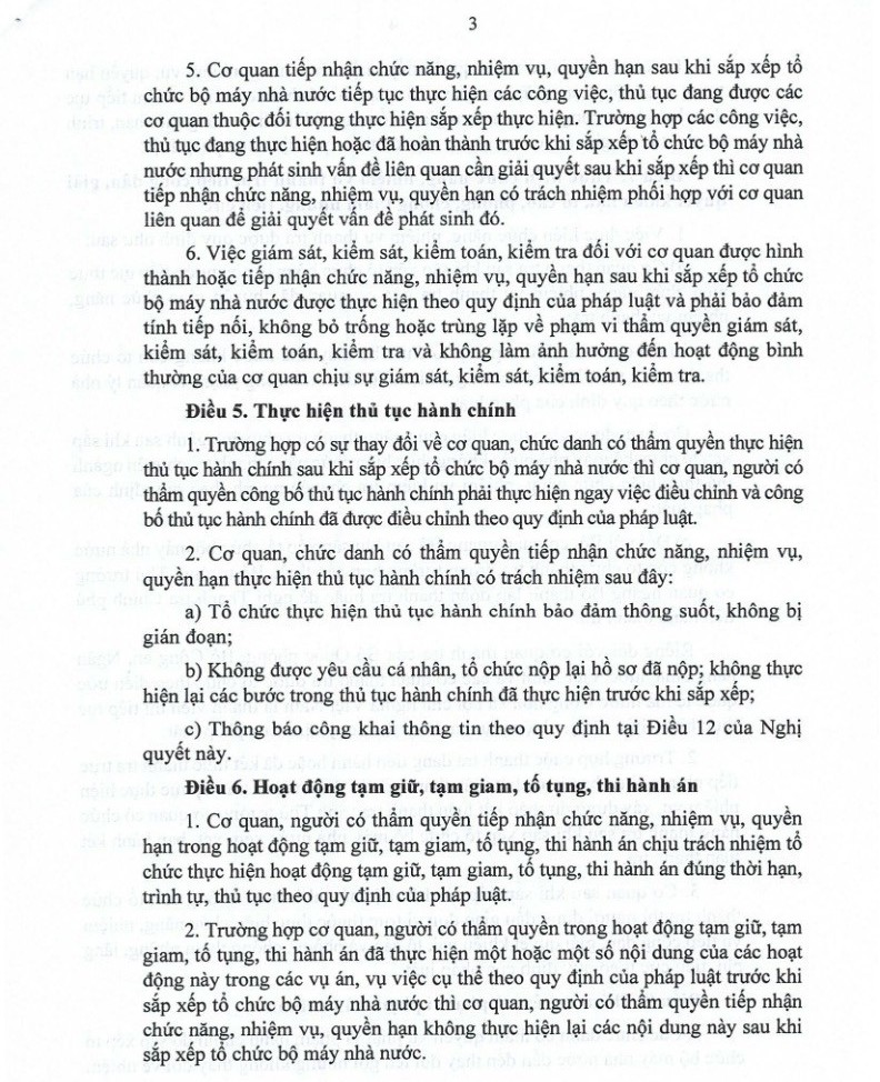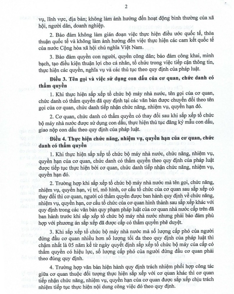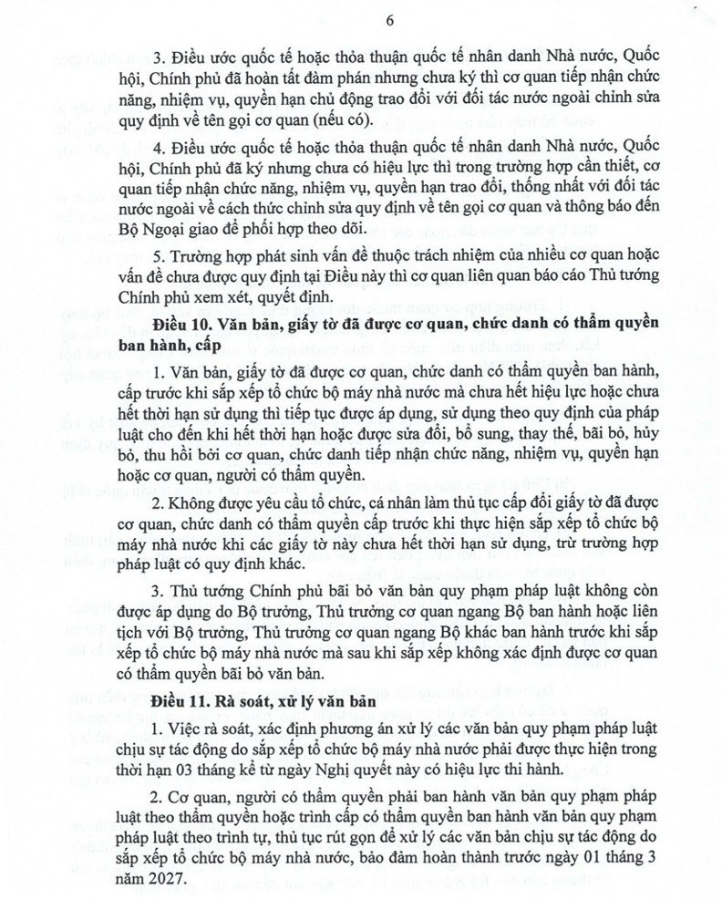 Nghị quyết nêu rõ: Khi thực hiện sắp xếp tổ chức bộ máy nhà nước, tên gọi của cơ quan, chức danh có thẩm quyền đã quy định tại các văn bản được chuyển đổi theo tên gọi của cơ quan, chức danh tiếp nhận chức năng, nhiệm vụ, quyền hạn đó.