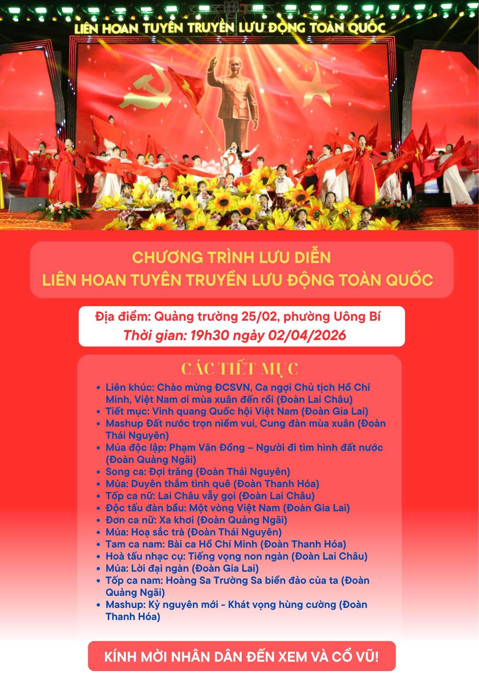 Tối 02/04, sân khấu Quảng trường 25/02 sẽ bùng nổ không khí nghệ thuật với chương trình lưu diễn thuộc Liên hoan Tuyên truyền lưu động toàn quốc!