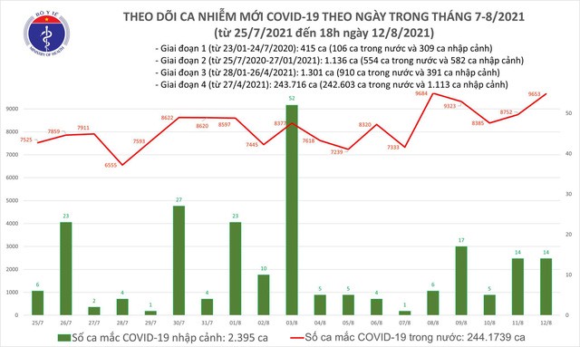 Tính đến chiều 12/8, Việt Nam có 246.568 ca nhiễm, trong đó có 2.395 ca nhập cảnh và 244.173 ca nhiễm trong nước. Số ca nhiễm mới ghi nhận trong nước tính của đợt dịch kể từ 27/4 đến nay là 242.603 ca, trong đó có 86.371 bệnh nhân đã được công bố khỏi bệnh.