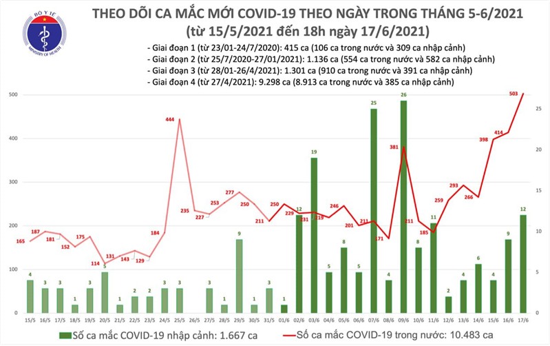 Tính đến 18h ngày 17/6, Việt Nam có 10.483 ca ghi nhận trong nước và 1.667 ca nhập cảnh. Số lượng ca mắc mới tính từ ngày 27/4 đến nay là 8.913, trong đó có 1.879 bệnh nhân đã được công bố khỏi bệnh.