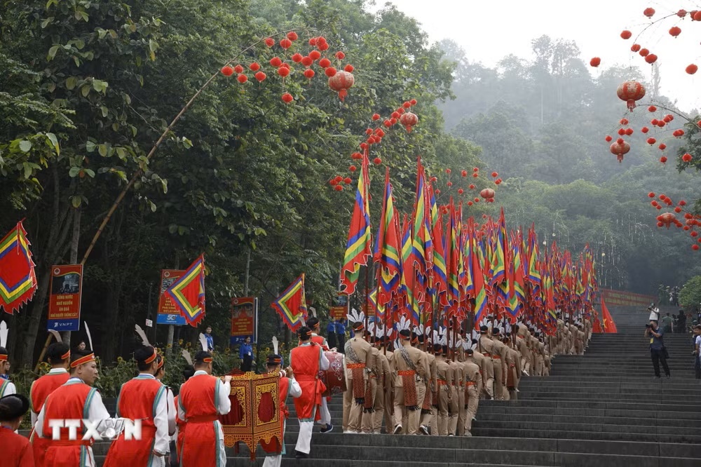 Đoàn nghi lễ rước kiệu khởi hành lên núi Nghĩa Lĩnh, nơi thờ tự các Vua Hùng - Ảnh: TTXVN