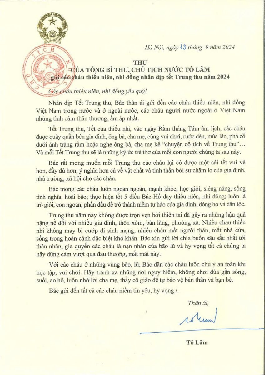 Nhân dịp Tết Trung thu 2024, ngày 13/9, Tổng Bí thư, Chủ tịch nước Tô Lâm đã gửi thư cho các cháu thiếu niên, nhi đồng Việt Nam ở trong và ngoài nước, các cháu người nước ngoài ở Việt Nam.