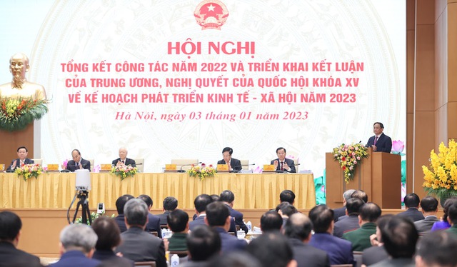Thủ tướng Phạm Minh Chính nêu rõ: Nội dung phát biểu chỉ đạo rất tình cảm, nồng ấm, tâm huyết, sâu sắc, tổng thể, toàn diện trên các lĩnh vực của Tổng Bí thư Nguyễn Phú Trọng đã tạo thêm động lực, truyền cảm hứng, là nguồn động viên, chia sẻ, khích lệ to lớn và là những đánh giá sát thực, tư tưởng chỉ đạo, định hướng xuyên suốt cho Chính phủ, các cấp, các ngành, các địa phương trên cả nước triển khai thực hiện nhiệm vụ năm 2023 và những năm sắp tới - Ảnh: VGP/Nhật Bắc