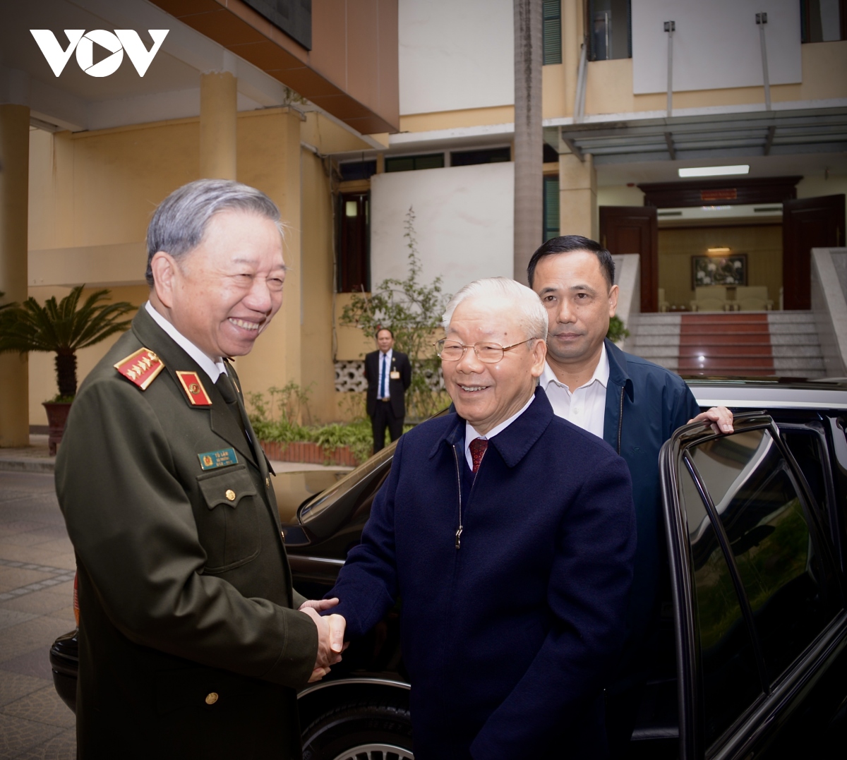 Bộ trưởng Bộ Công an Tô Lâm chào đón Tổng Bí thư Nguyễn Phú Trọng
