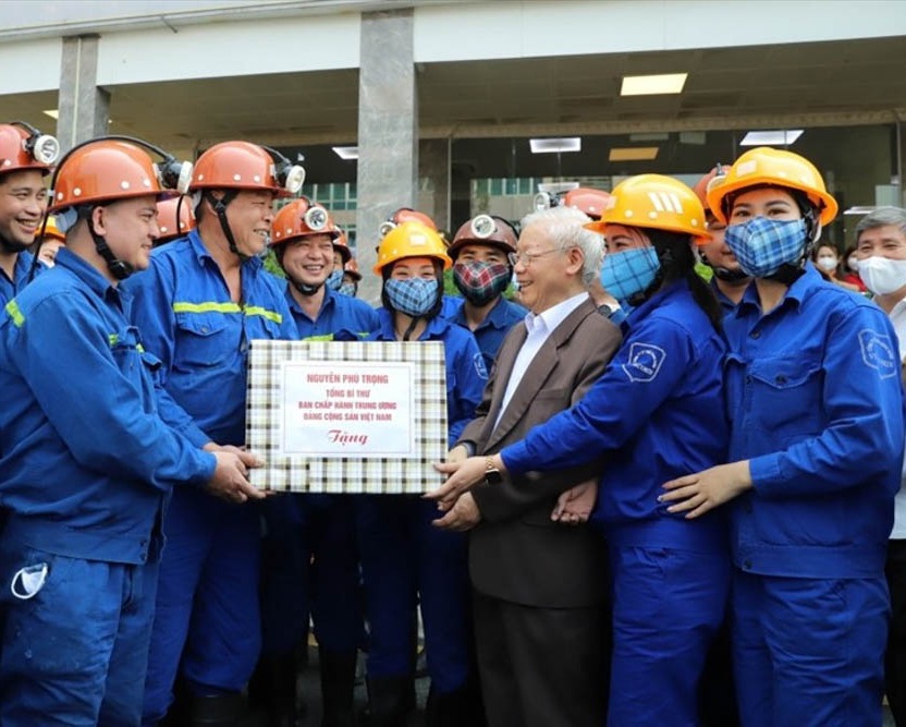 Tổng Bí thư Nguyễn Phú Trọng tặng quà tập thể cán bộ, công nhân viên Công ty Cổ phần Than Vàng Danh – Vinacomin, tại TP Uông Bí, Quảng Ninh, tháng 4.2022. Ảnh: VOV