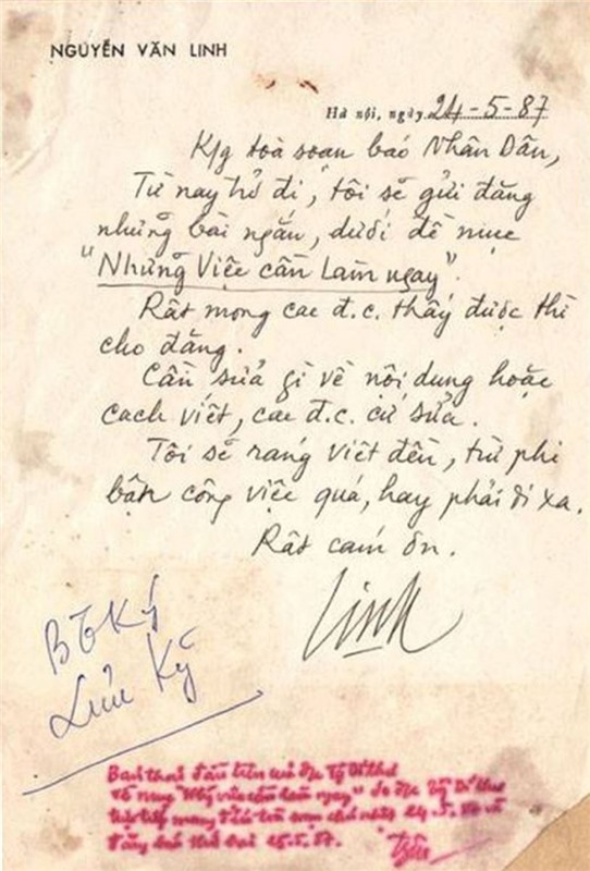 Thư của Tổng Bí thư Nguyễn Văn Linh gửi Ban Biên tập báo Nhân dân về loạt bài "Những việc cần làm ngay".
