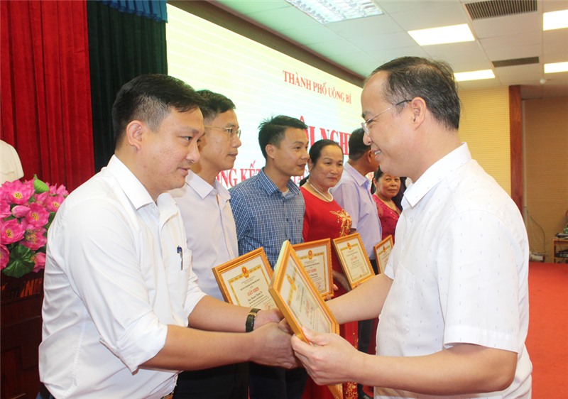Các đồng chí lãnh đạo thành phố trao khen thưởng cho các tập thể, cá nhân có thành tích xuất sắc.
