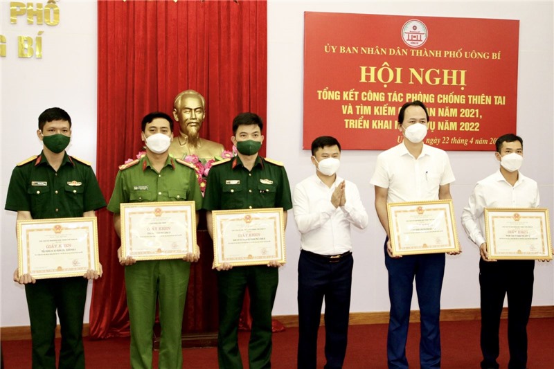 Tại hội nghị tổng kết, UBND thành phố đã khen thưởng 5 tập thể, 10 cá nhân có thành tích xuất sắc trong công tác PCTT, TKCN năm 2021.