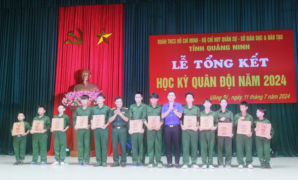 Lãnh đạo Bộ CHQS tỉnh, Tỉnh đoàn Quảng Ninh tặng quà các em học sinh có thành tích xuất sắc trong khóa học.