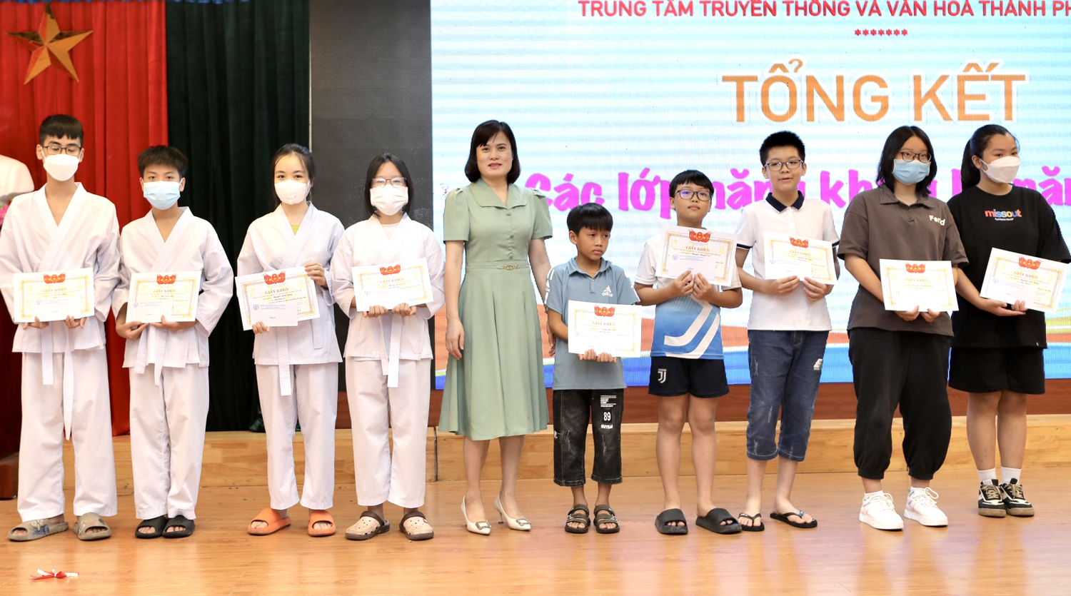 Lãnh đạo Trung tâm TT-VH thành phố khen thưởng các học sinh có thành tích xuất sắc.