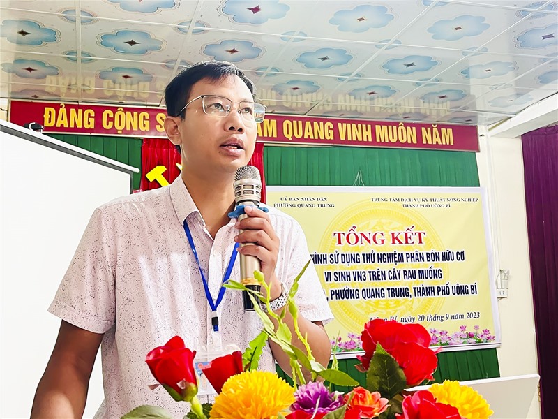 Ngày 20/9, UBND phường Quang Trung và Trung tâm Dịch vụ kỹ thuật nông nghiệp thành phố phối hợp tổ chức Hội nghị tổng kết Mô hình sử dụng thử nghiệm phân bón hữu cơ vi sinh VN3 trên cây rau muống tại khu 11, phường Quang Trung. Dự hội nghị có lãnh đạo Trung tâm Dịch vụ kỹ thuật nông nghiệp, Hội Nông dân thành phố.