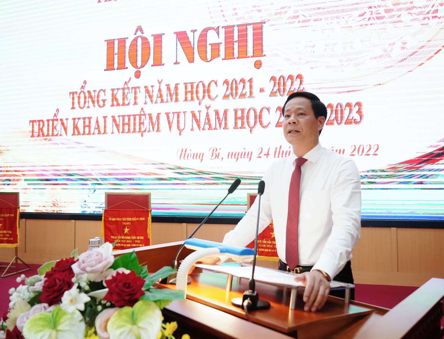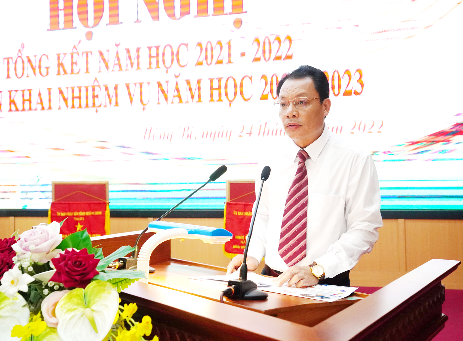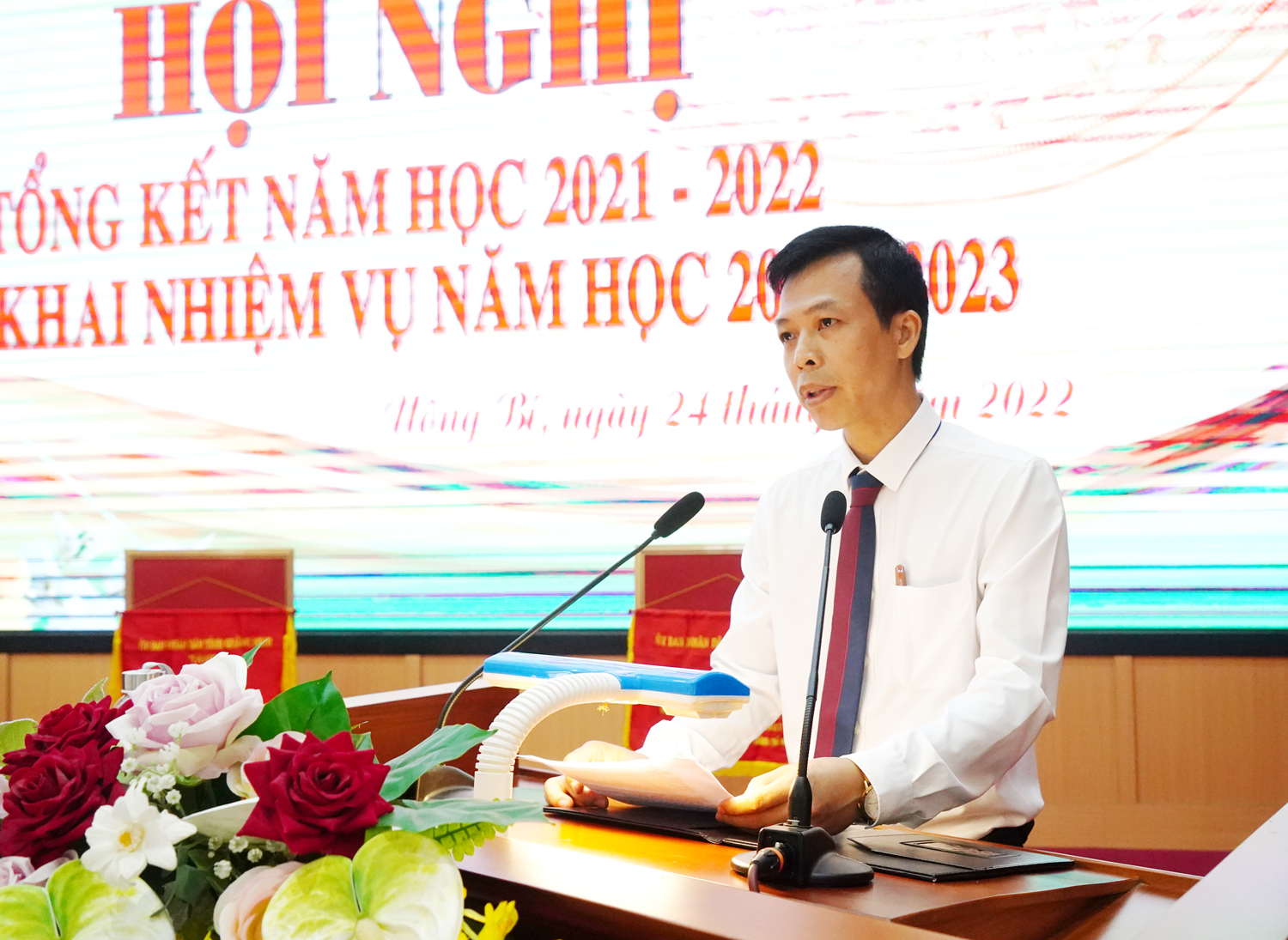 Phát biểu chỉ đạo tại hội nghị, đồng chí Phạm Tuấn Đạt, Phó Bí thư Thành uỷ, Chủ tịch UBND thành phố ghi nhận, đánh giá cao những nỗ lực và kết quả, thành tích nổi bật của ngành giáo dục - đào tạo thành phố trong năm học 2021-2022. Bên cạnh đó, đồng chí cũng ghi nhận tinh thần thẳng thắn, đồng tình với những tồn tại, hạn chế đã được ngành giáo dục nhận diện và chỉ ra trong báo cáo. Trong năm học 2022-2023, đồng chí Chủ tịch UBND thành phố yêu cầu toàn ngành bám sát chỉ đạo của cấp trên, triển khai các nhiệm vụ năm học. Trong đó đặc biệt chú trọng việc rà soát, tuyên truyền, vận động phụ huynh đưa con em đi tiêm vắc xin phòng Covid-19 theo đúng kế hoạch và chỉ tiêu, làm cơ sở để tổ chức hoạt động dạy học thích ứng, an toàn, hiệu quả; thực hiện hiệu quả việc dạy và học, chú trọng giáo dục toàn diện đức, trí, thể, mỹ, giáo dục đạo đức, lối sống, kỹ năng sống cho học sinh; bố trí đội ngũ giáo viên hợp lý, đáp ứng yêu cầu nhiệm vụ.