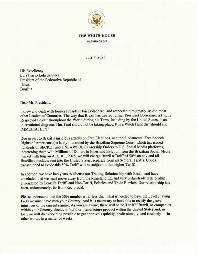Trong thư gửi Tổng thống Brazil Luiz Inacio Lula da Silva, Tổng thống Trump cho biết “do một phần vì ‘các cuộc tấn công ngầm’ của Brazil vào các cuộc bầu cử tự do và quyền tự do ngôn luận cơ bản của người dân Mỹ... chúng tôi sẽ áp mức thuế 50% đối với mọi sản phẩm Brazil nhập vào Mỹ”.