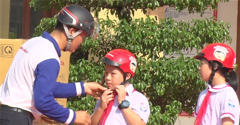 Trao tặng và hướng dẫn các em học sinh đội mũ bảo hiểm.