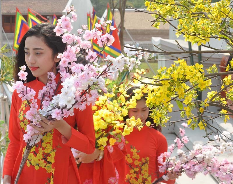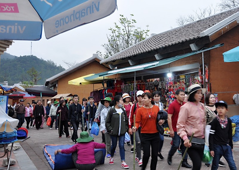Du khách hào hứng tham gia lễ hội Hoa Anh đào - Mai vàng Yên Tử tại dưới chân Yên Tử, quê hương của loại hoa mai vàng Yên Tử. Ảnh: Minh Hà