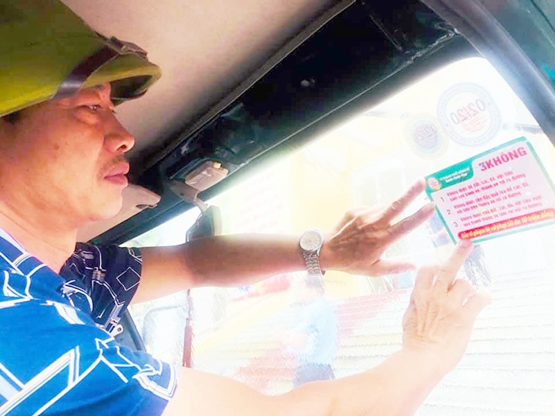 Một lái xe tải của TP Uông Bí dán quy định về bảo vệ môi trường lên xe để ghi nhớ. Ảnh Hồng Nhung (Trung tâm TT-VH Uông Bí)