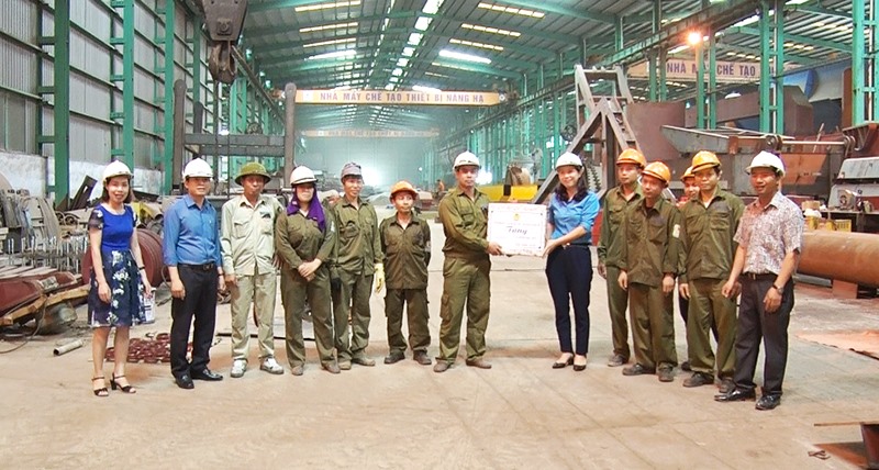 Đại diện Liên đoàn Lao động TP Uông Bí tặng quà cán bộ, nhân viên Xí nghiệp cơ khí Quang Trung nhân 90 năm ngày thành lập Công đoàn Việt Nam.