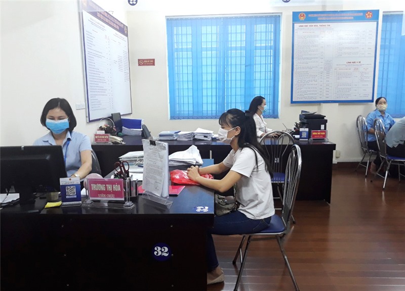 Người dân đến giao dịch, cán bộ tại Trung tâm Hành chính công thành phố chấp hành nghiêm túc đeo khẩu trang phòng chống dịch.