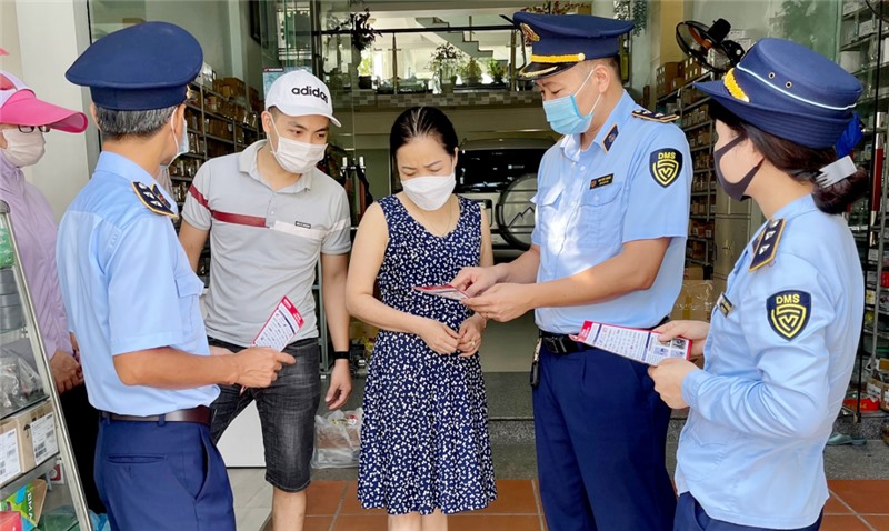 Cán bộ Đội QLTT số 6 tuyên truyền, vận động các hộ kinh doanh chấp hành nghiêm các quy định về kinh doanh thương mại.