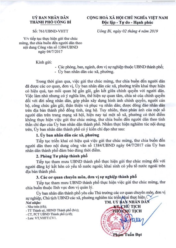 Nhằm thực hiện chủ đề công tác năm 2019 của tỉnh và thành phố “Nâng cao chất lượng và hiệu quả dịch vụ”, tiếp tục xây dựng nếp sống văn hóa, văn minh, tăng cường gắn kết giữa người dân và chính quyền, UBND thành phố Uông Bí vừa ban hành văn bản chỉ đạo các phòng ban, đơn vị, xã phường tiếp tục thực hiện việc gửi thư chúc mừng, thư chia buồn tới các sự kiện của người dân trên địa bàn.