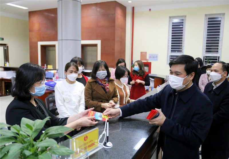 Đồng chí Nguyễn Tường Văn,Phó Bí thư Tỉnh ủy, Chủ tịch UBND tỉnh, lì xì năm mới, động viên tinh thần làm việc của các CBCCVC Kho bạc Nhà nước tỉnh Quảng Ninh làm nhiệm vụ quyết toán, khóa sổ ngân sách trong ngày cuối cùng của năm 2021.