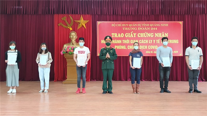 Chiều 23/12, tại phường Nam Khê, TP Uông Bí, Trung đoàn 244, Bộ CHQS tỉnh Quảng Ninh, tổ chức trao giấy chứng nhận cho 62 công dân hoàn thành thời gian cách ly tập trung phòng, chống dịch Covid-19.
