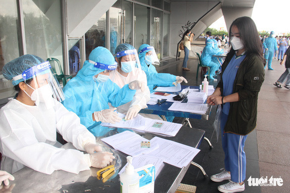 Học sinh khai báo y tế và điền vào phiếu thông tin tiêm chủng tại Cung thể thao Tiên Sơn - Đà Nẵng - Ảnh: TRƯỜNG TRUNG