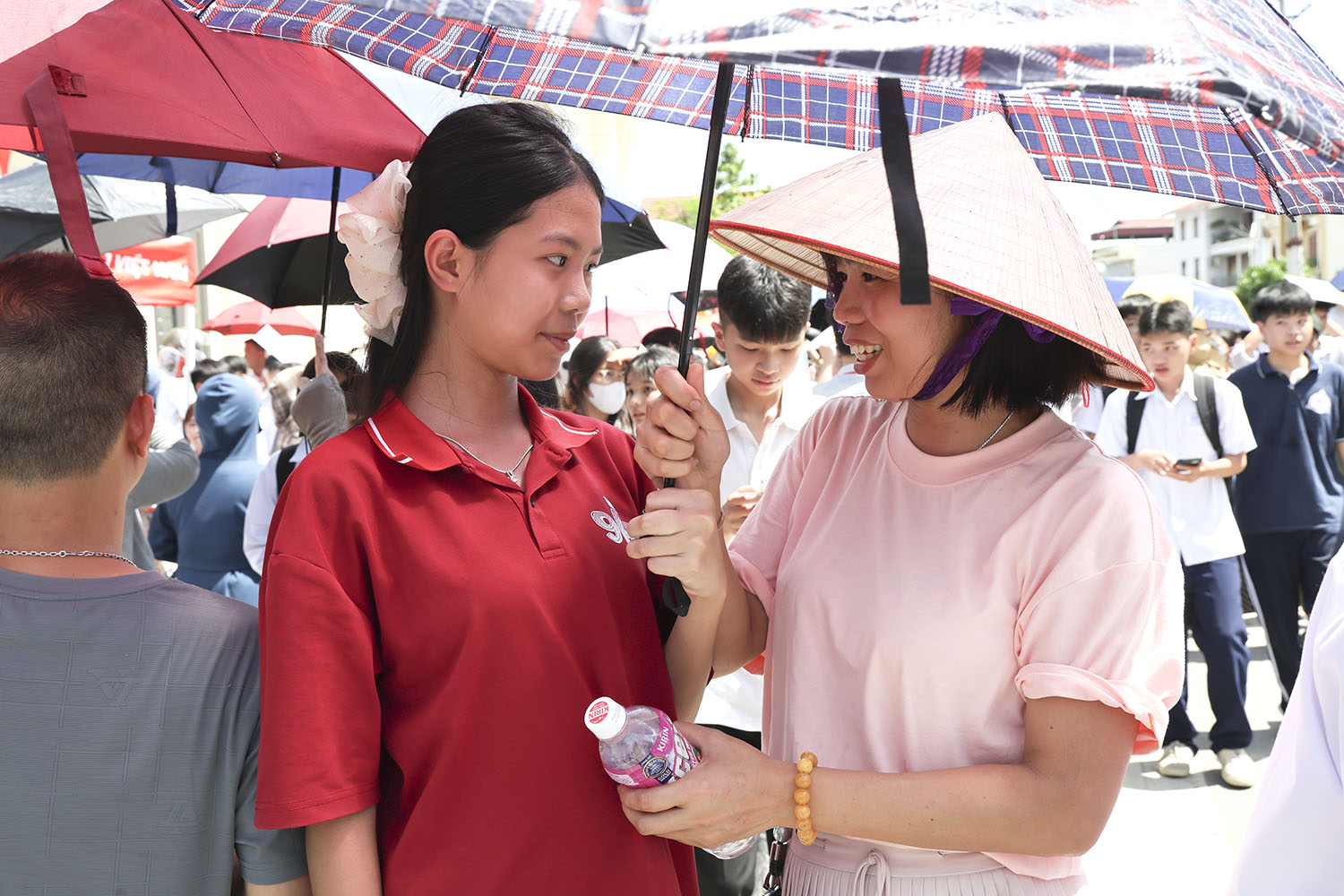 Phụ huynh động viên con em sau khi hoàn thành môn thi đầu tiên.