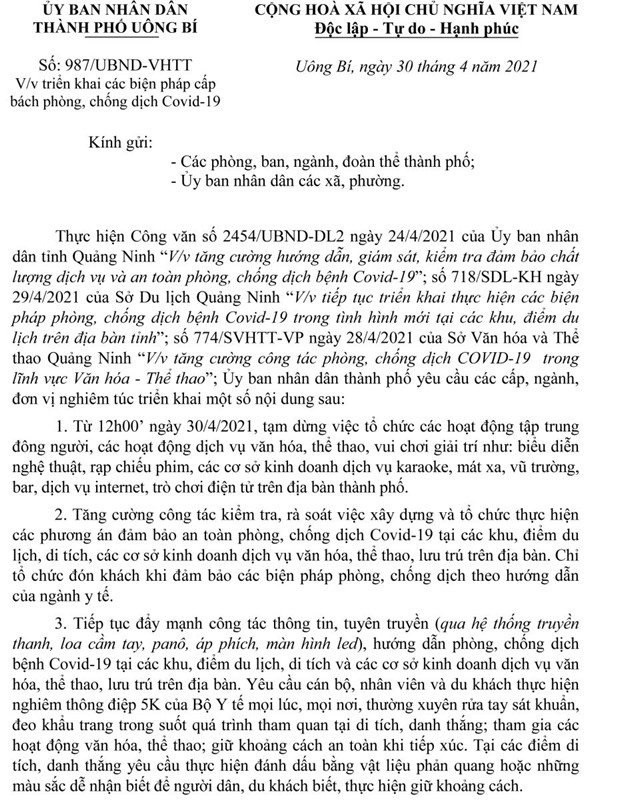 Ngày 30-4, UBND thành phố ban hành văn bản số 987/UBND-VHTT về việc triển khai các biện pháp cấp bách phòng, chống dịch bệnh covid-19