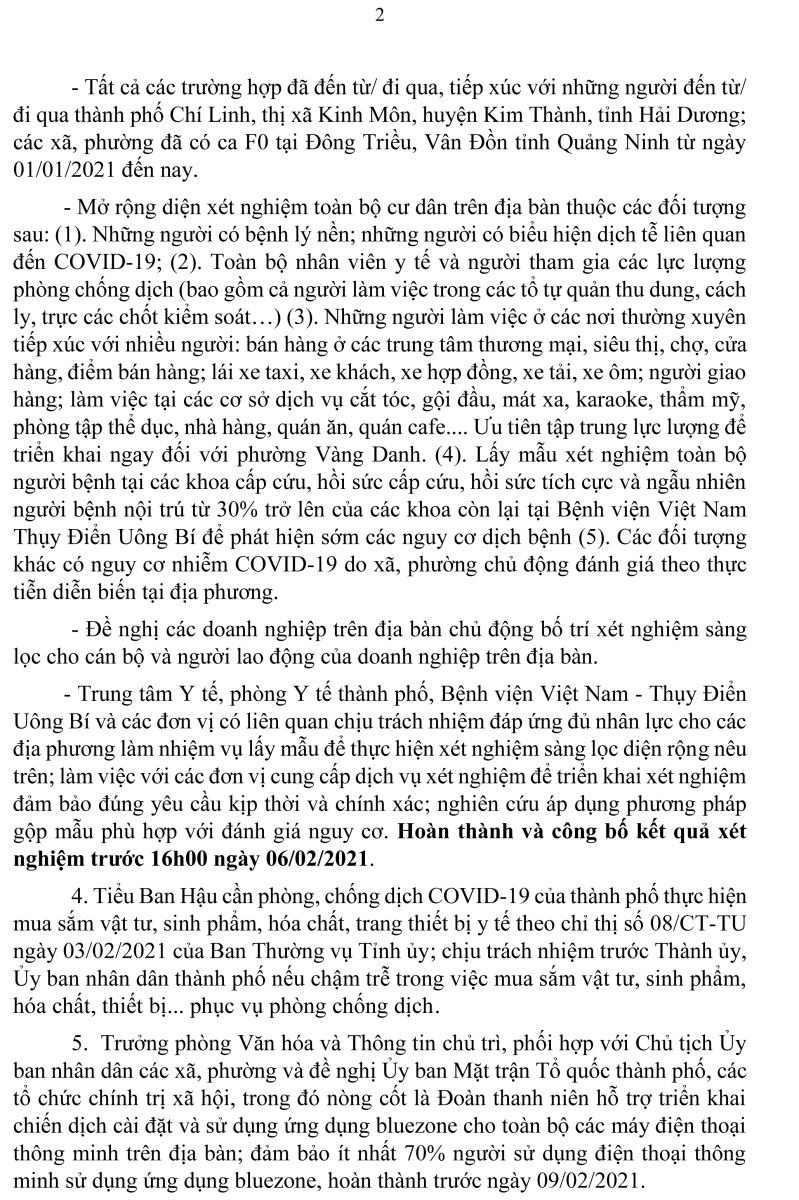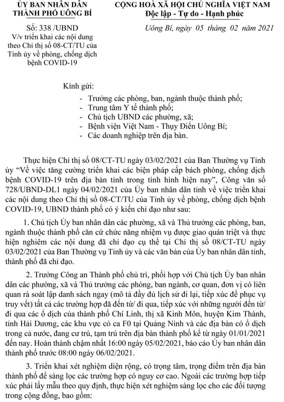 Ngày 5-1, UBND thành phố Uông Bí ban hành văn bản số 338/UBND V/v Triển khai các nội dung theo Chỉ thị số 08-CT/TU của Tỉnh ủy về phòng, chống dịch bệnh COVID-19.
