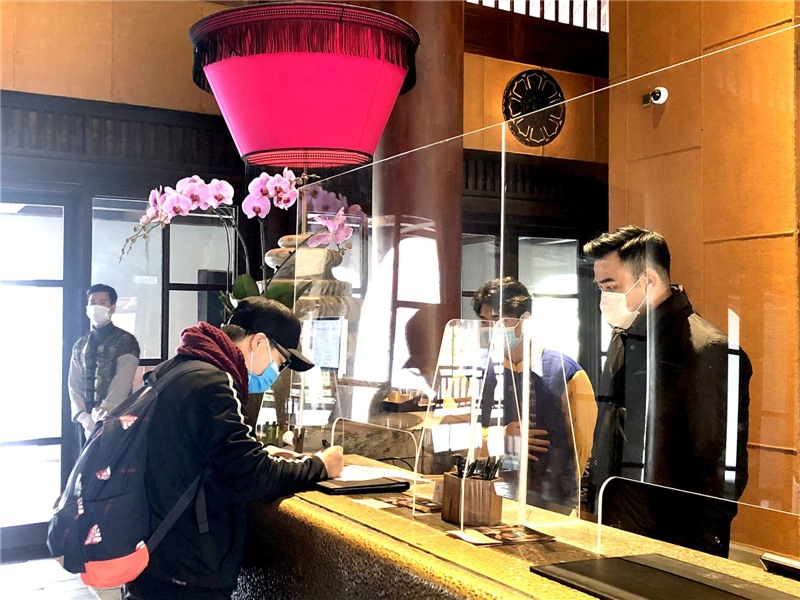 Khu nghỉ dưỡng Legacy Yên Tử sử dụng màn chắn ở quầy lễ tân để đảm bảo phòng, chống dịch Covid-19.