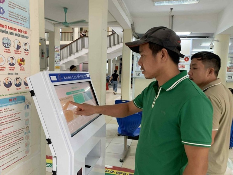 Người bệnh lấy số khám tự động tại Kiosk thông minh tại Bệnh viện 19-8 (Bộ Công an).