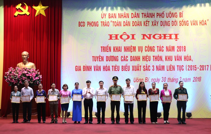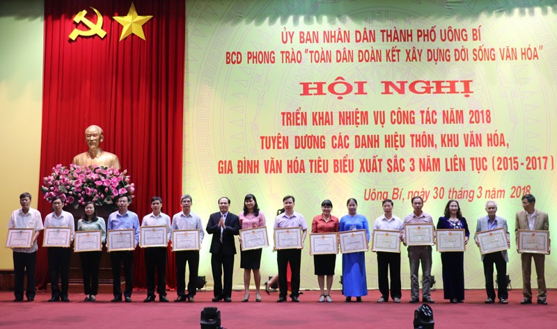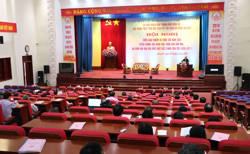 Ngày 30-3, UBND, BCĐ phong trào toàn dân đoàn kết xây dựng đời sống văn hóa thành phố tổ chức hội nghị triển khai nhiệm vụ năm 2018, tuyên dương thôn khu văn hóa, gia đình văn hóa tiêu biểu xuất sắc 3 năm liên tiếp (2015-2017). Dự hội nghị có các đồng chí: Trần Văn Lâm, Tỉnh ủy viên, Bí thư Thành ủy, Chủ tịch HĐND thành phố; Phạm Tuấn Đạt, Phó Chủ tịch UBND thành phố, Trưởng BCĐ phong trào toàn dân đoàn kết xây dựng đời sống văn hóa thành phố.
