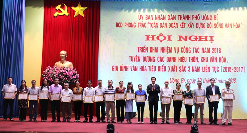 Tại hội nghị, UBND thành phố đã biểu dương, khen thưởng 5 tập thể, 9 cá nhân có thành tích xuất sắc trong phong trào toàn dân đoàn kết xây dựng đời sống văn hóa năm 2017; biểu dương, khen thưởng 5 thôn, khu giữ vững danh hiệu thôn khu văn hóa 3 năm liên tục, 44 gia đình văn hóa xuất sắc tiêu biểu 3 năm liên tục. Nhân dịp này, 5 tập thể và 8 cá nhân có thành tích xuất sắc trong phong trào thi đua dân vận khéo năm 2017 cũng đã được khen thưởng.