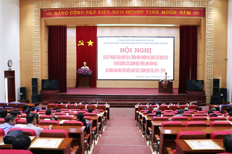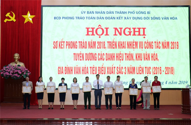 Ngày 5-4, UBND, BCĐ phong trào toàn dân đoàn kết xây dựng đời sống văn hóa thành phố Uông Bí tổ chức hội nghị sơ kết phong trào năm 2018, triển khai nhiệm vụ năm 2019, tuyên dương các thôn, khu, gia đình văn hóa tiêu biểu xuất sắc 3 năm liên tục (2016-2018). Dự, chỉ đạo hội nghị có các đồng chí: Trần Tiến Dũng, Phó Giám đốc Sở Văn hóa - Thể thao; Phạm Tuấn Đạt, UV BTV Thành ủy, Phó Chủ tịch UBND, Trưởng BCĐ phong trào toàn dân đoàn kết xây dựng đời sống văn hóa thành phố.