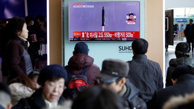 Các hành khách theo dõi thông tin về vụ phóng tên lửa của CHDCND Triều Tiên tại một ga tàu ở Seoul, Hàn Quốc, ngày 12-2-2017. (Ảnh: Reuters)