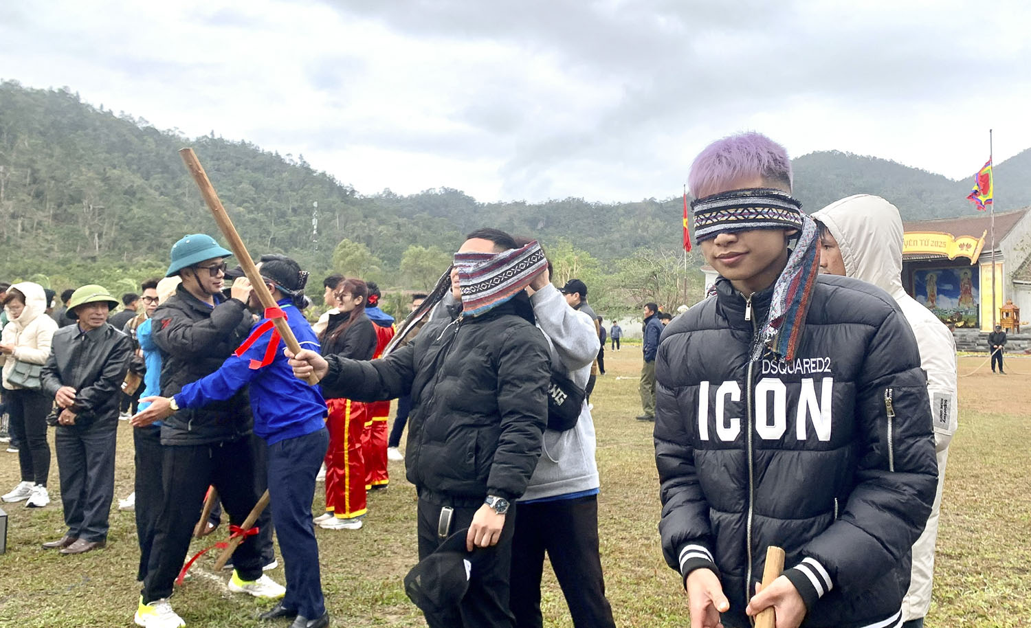 Đập niêu là trò chơi thú vị, nơi người tham gia phải bịt mắt, đập những chiếc niêu đất, tạo không khí sôi nổi hào hứng trong không gian lễ hội.