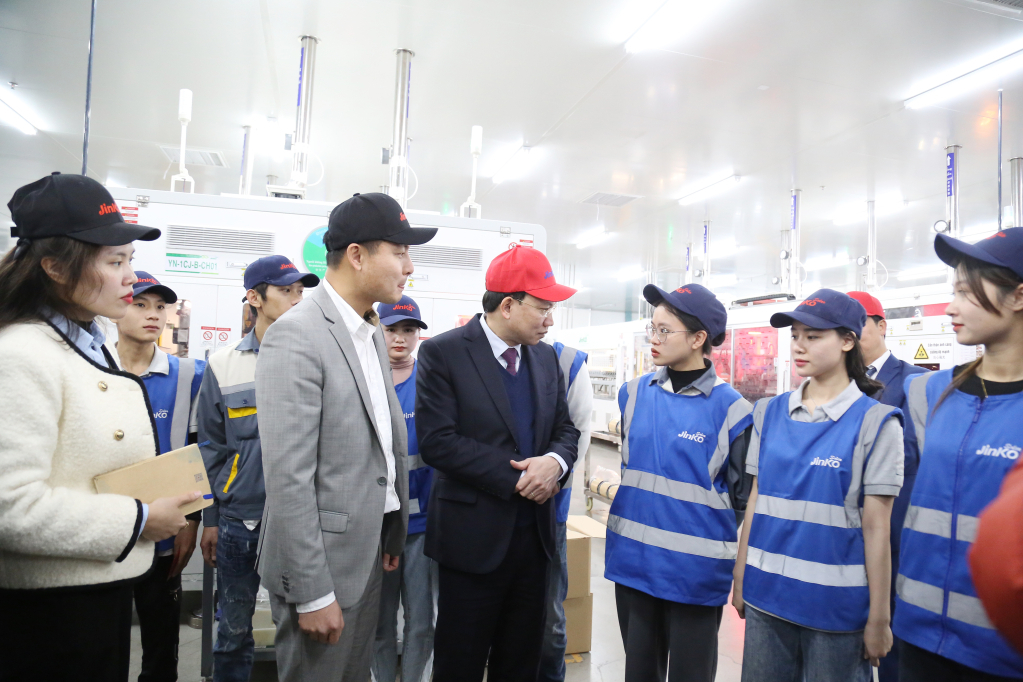 Đồng chí Nguyễn Xuân Ký, Ủy viên Trung ương Đảng, Bí thư Tỉnh ủy, Chủ tịch HĐND tỉnh thăm, động viên công nhân làm việc xuyên Tết tại Công ty TNHH Công nghiệp Jinko Solar Việt Nam (KCN Sông Khoai) ngày mùng 1 Tết.