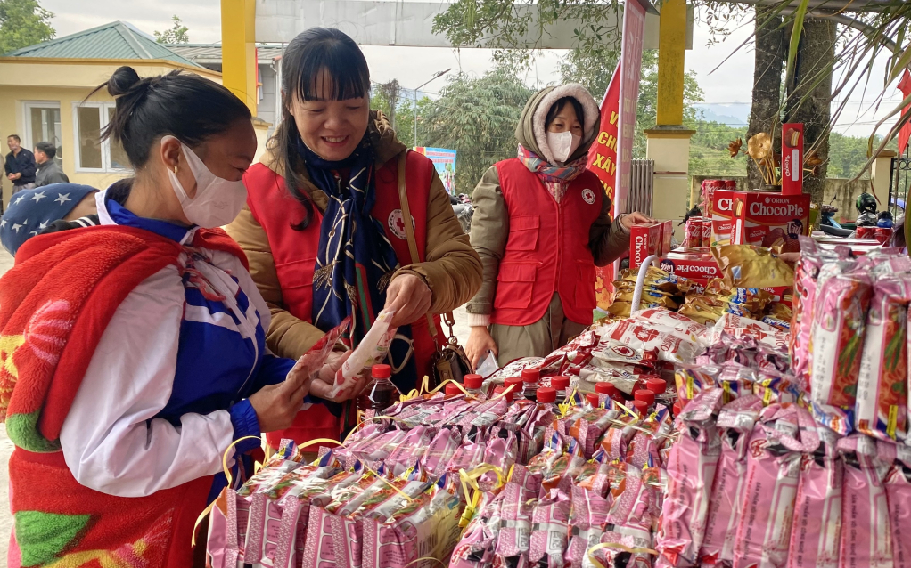 Người dân lựa chọn sản phẩm thiết yếu tại Chương trình chợ "Tết nhân ái" - Xuân Giáp Thìn 2024 tại xã Quảng Đức (huyện Hải Hà).