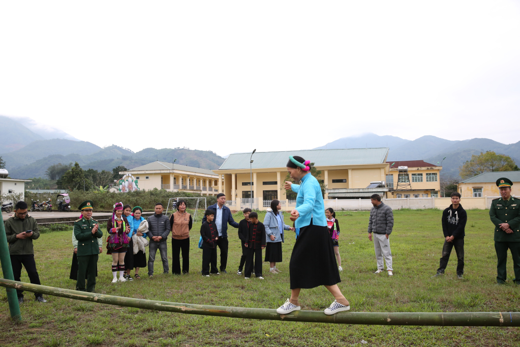 Người dân xã Hải Sơn (TP Móng Cái) thích thú với trò đi cầu khỉ trong ngày Tết.