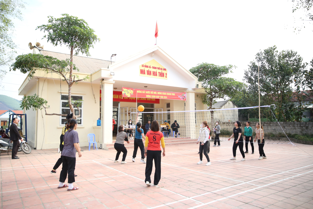 Người dân phấn khởi đánh bóng chuyền hơi rèn luyện sức khỏe tại Nhà văn hóa thôn 2, xã Bằng Cả (TP Hạ Long) ngày Tết.