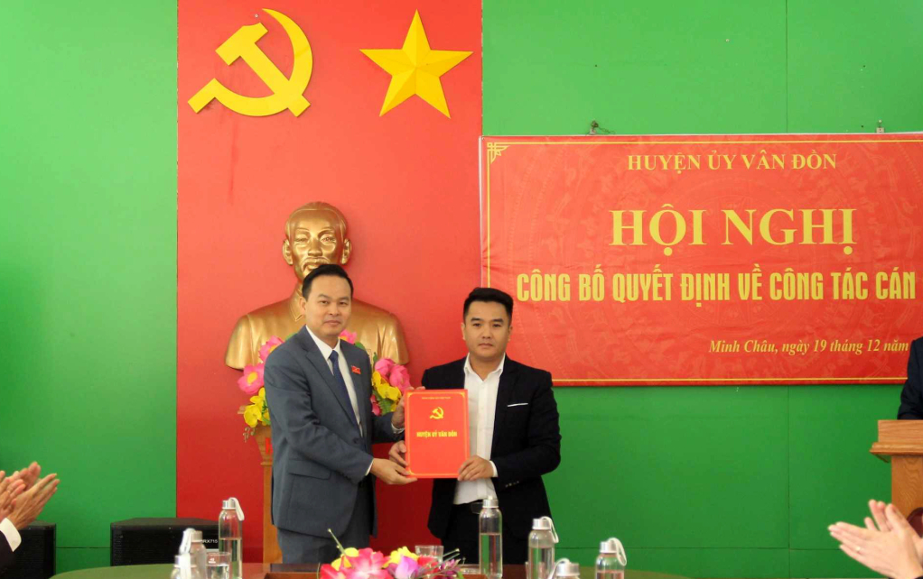 Đồng chí Trương Mạnh Hùng, Bí thư Huyện uỷ Vân Đồn trao quyết định điều động và chỉ định đồng chí Nguyễn Thanh Sơn, Phó chánh Văn phòng Huyện uỷ giữ chức vụ Bí thư Đảng uỷ xã Minh Châu, nhiệm kỳ 2020-2025.