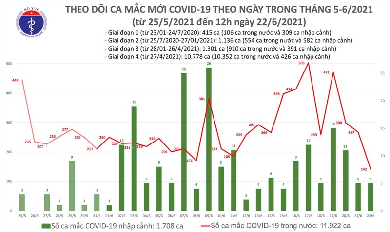 Trưa 22/6, Bộ Y tế cho biết, có thêm 100 ca mắc COVID-19 tại 13 tỉnh, thành phố, riêng Bình Dương chiếm 33 ca. Đến nay, Việt Nam tổng cộng có 13.630 bệnh nhân.