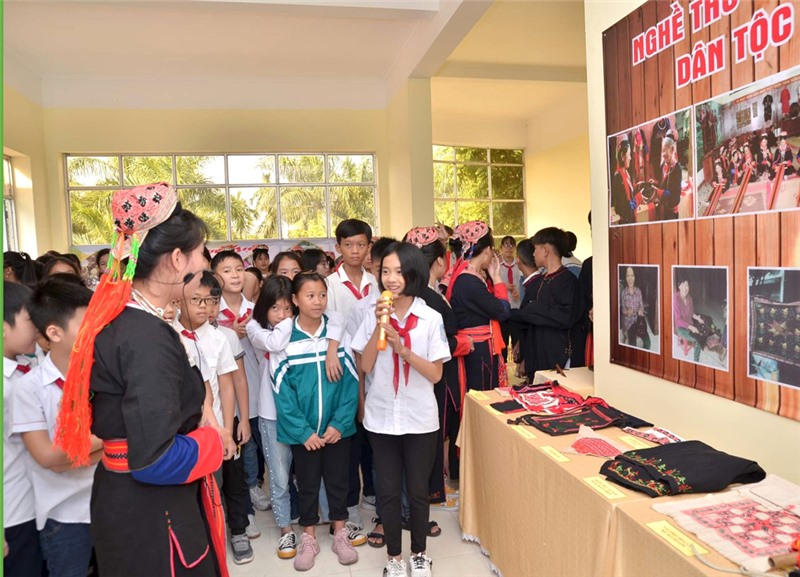 Các em học sinh hào hứng tìm hiểu về trang phục truyền thống của dân tộc Dao Thanh Y.