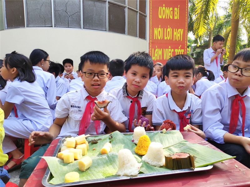 Các em học sinh thưởng thức xôi nếp ngũ sắc - món ăn truyền thống của dân tộc Dao Thanh Y.