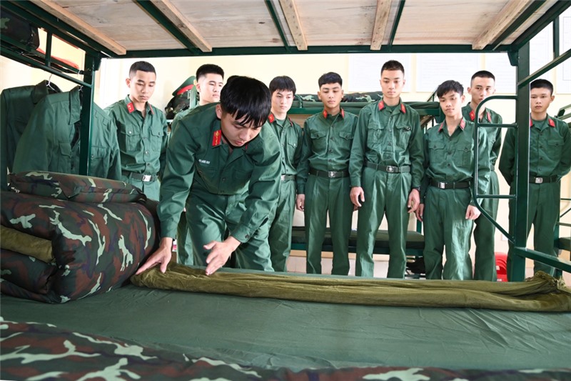 Ngay khi vào đơn vị, chiến sĩ mới được hướng dẫn sắp xếp nội vụ. Ảnh: Văn Đảm (Bộ CHQS tỉnh)