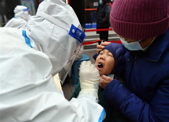 Nhân viên y tế lấy mẫu xét nghiệm COVID-19 cho người dân tại Tây An, tỉnh Thiểm Tây, Trung Quốc, ngày 2/1/2022. Ảnh: THX/TTXVN