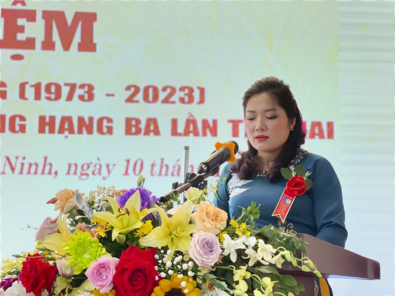 Tiến sĩ Nguyễn Thị Hoài, Phó Bí thư Đảng ủy, Hiệu trưởng Trường Cao đẳng nghề xây dựng diễn văn ôn lại truyền thống 50 năm xây dựng và phát triển.